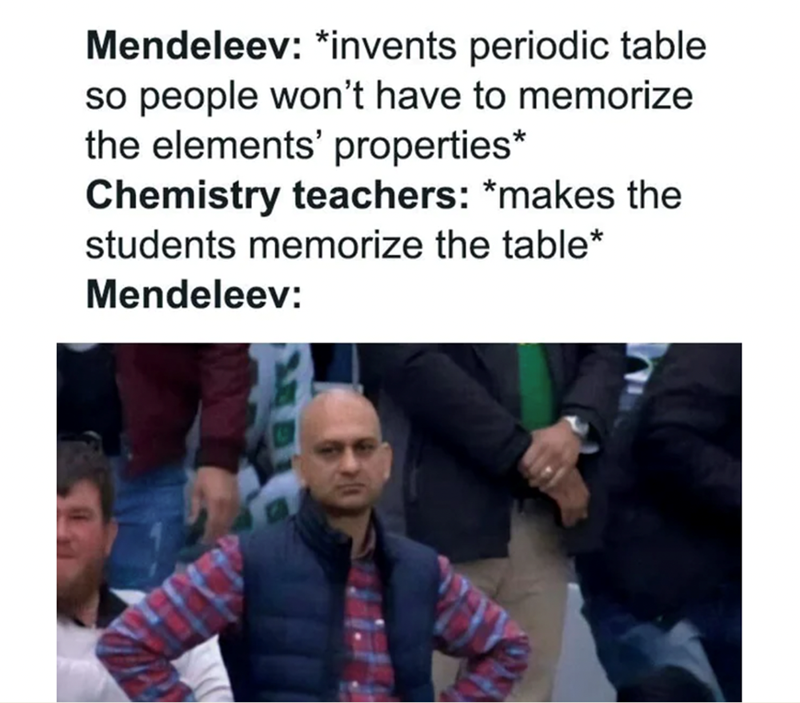 Yeah this is exactly why I mentally checked out of chemistry. Memorization was being pushed harder than conceptual understanding.