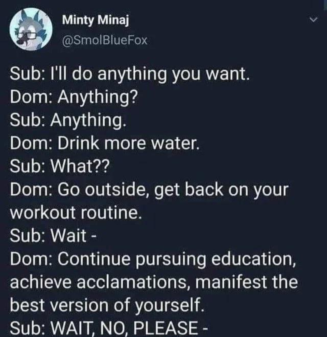 Imagine how great it would be if you had a dom who could think of your best interests and nag you to do the right thing oh wait we just reinvented parents with extra steps.