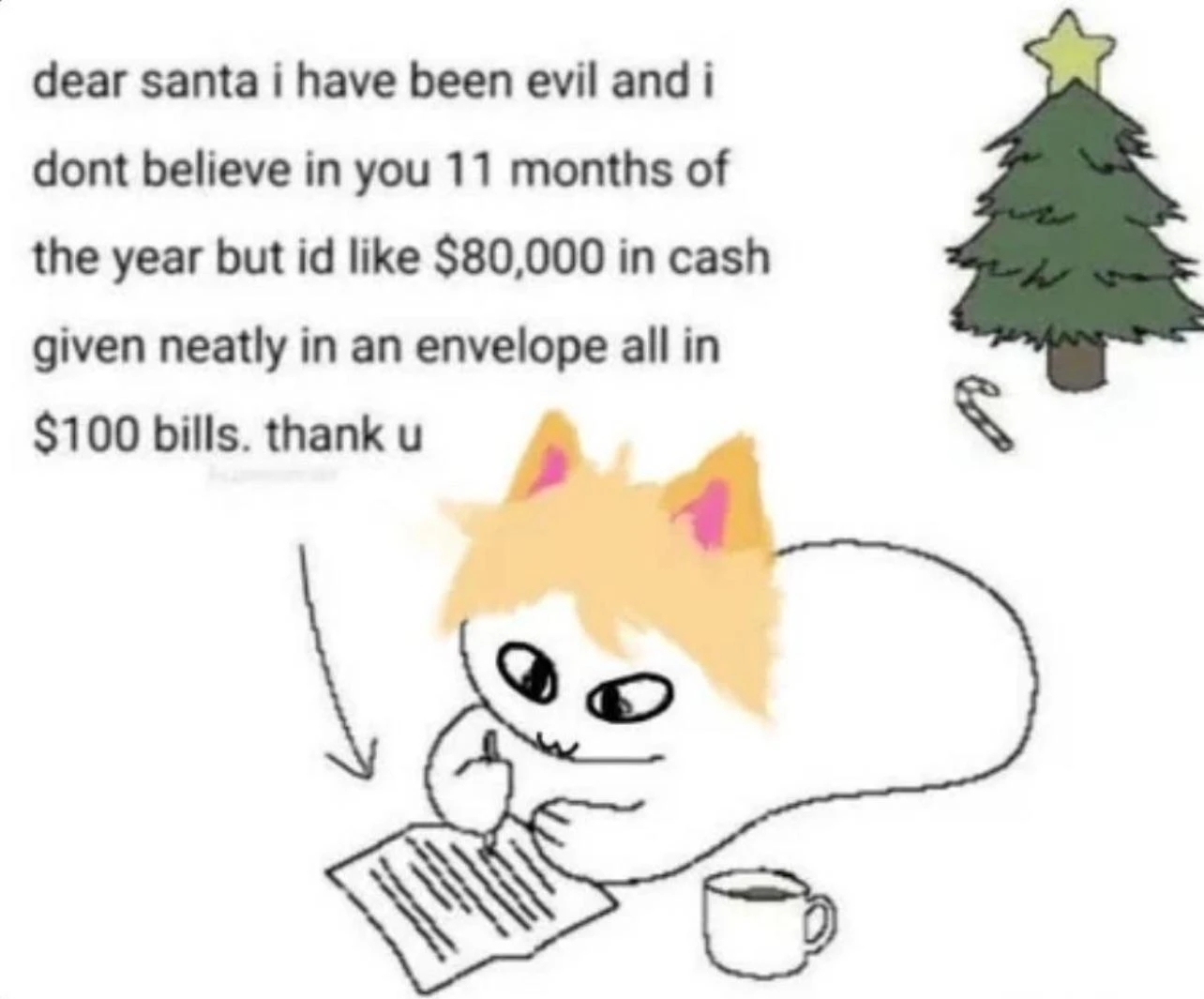 minus-squareTotallynotJessica@lemmy.blahaj.zoneOPMlinkfedilinkEnglisharrow-up21·26 days agoMany people don’t know this, but Santa is actually the evil version of Satan