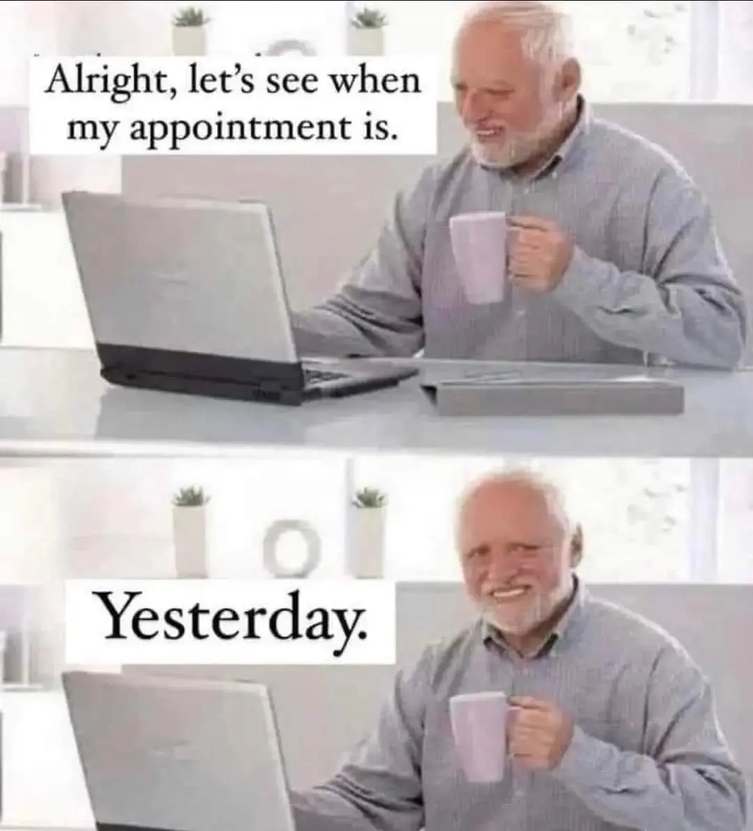 minus-squaredejected_warp_core@lemmy.worldlinkfedilinkEnglisharrow-up2·edit-27 days ago Oh wow, that is so me. That had better be under… yep, ADHD… yeah, that’s in the right place. It’s worse when this triggers life-long anxiety about missing future appointments. Worse still is when you show up a week early by accident, because you had it wrong in the other direction.