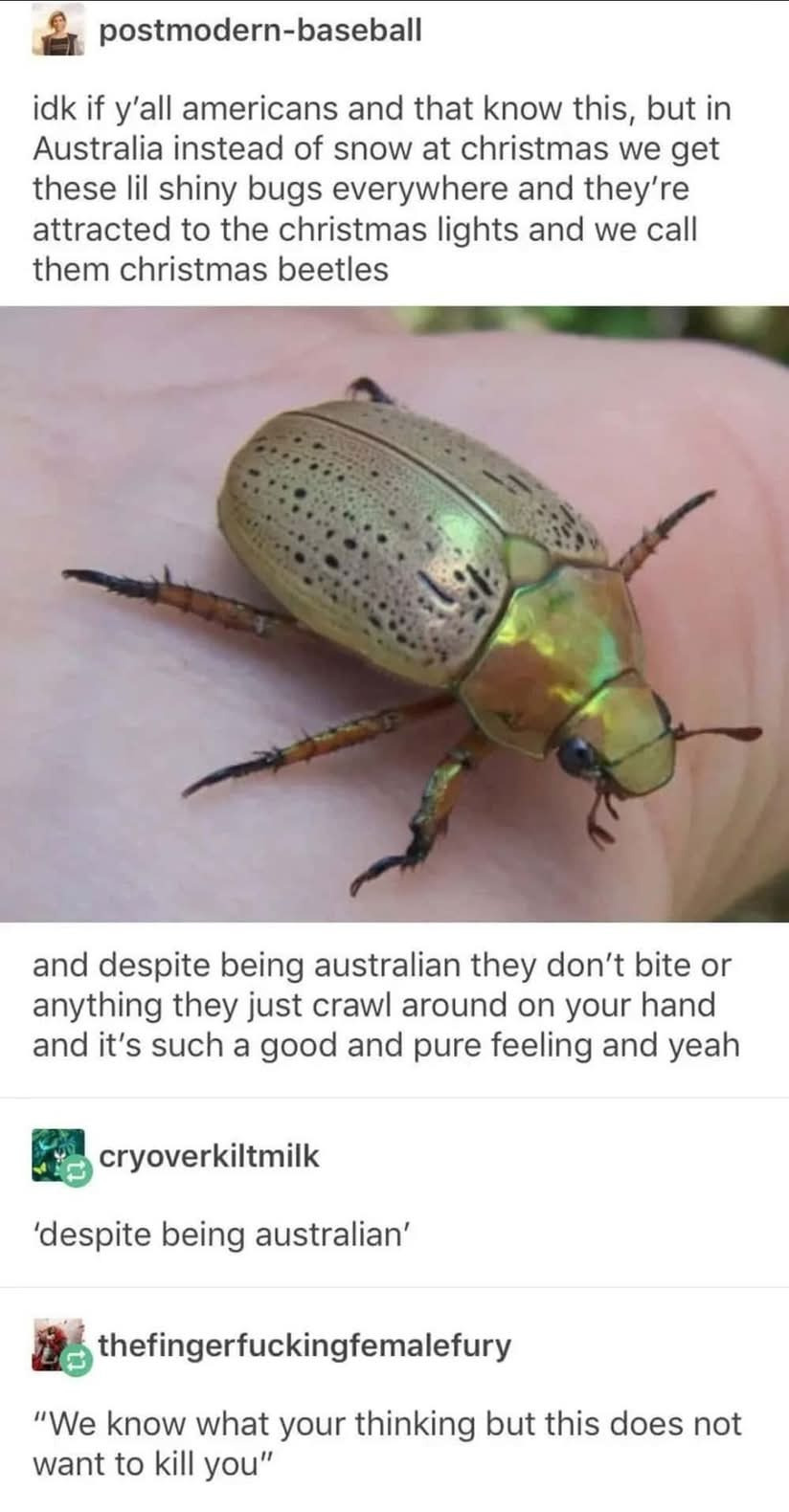 “This beetle merely wishes to join you in the celebration of the birth of a particular Palestinian prophet, and would like to encourage you to consider including beetles into your festive goodwill”