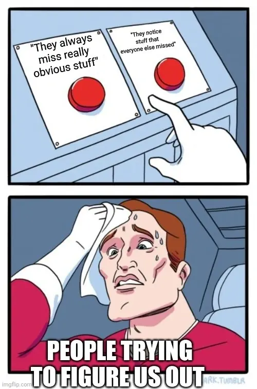 I think the level of noise filtering is lower in ADHD brains. It can lead to over-stimulation which means missing things and fatigue but a well rested ADHD person will tend to notice more than a NT. Being insensitive to the passage of time also gives the impression that we don’t care about meetings and are forgetful. Letting go of that has been a blessed relief.