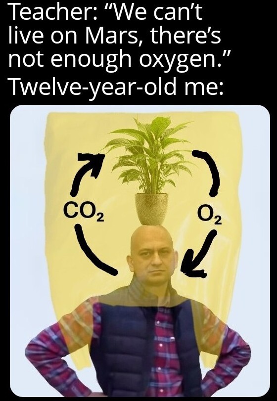 Plants actually use O2 themselves a lot of the time, so we would still need to truck in a whole bunch of that stuff in. Also the amount of plants needed for just a single human is huge. Most plants are rather bad at producing O2. Most of it actually comes from algae living in water, not potted plants. The YouTube channel Joel Creates did an experiment with how much algae you would actually need to breathe. It’s like a lot, a lot a lot really. Building some place on Mars or even in orbit that such a large amount of algae could happily live is pretty hard. Hell it’s pretty hard on Earth, where you don’t need to worry about temperature and pressure going out of spec or stuff like radiation. These days we do have pretty effective LED grow lights that prevent the whole thing from becoming too hot. From movies people think space is cold, but getting rid of heat is a big problem. With that much light blasting into the water, the temperature rises and the algae will die from that at some point. So radiating away all that heat is a must. On Mars or the Moon this is easier as the surrounding rocks could be used as a heat sink. The actual real hard part is not just building this, but building it in a way that can support human life for a long time. Systems such as these are chaotic in nature and often suffer from cascade failure modes. If a little thing goes wrong and some of the algae dies, it often cascades into a full failure where all of it dies off. So there would need to be many smaller systems, isolated as much as possible to prevent cascading failures. The system would also need to be modular enough so it would be easy to disconnect a module, completely clean and sterilize it and put it back into use. With staggered phases applied as to not have large swings in output. As these systems would be rather large in scale and have many different complex parts, a high level of automation is required. And we haven’t even touched on getting all of this constructed somewhere and have it bootstrapped with enough water, with the right stuff in it and none of the wrong stuff. Enough reliable energy and nutrients to feed it all and transport living algae there to kick it all off. As far as I know nobody has ever gotten close to anything like this on Earth, let alone in space or on a place like the Moon or Mars. It would be a project that rivals the original Moon landings.
