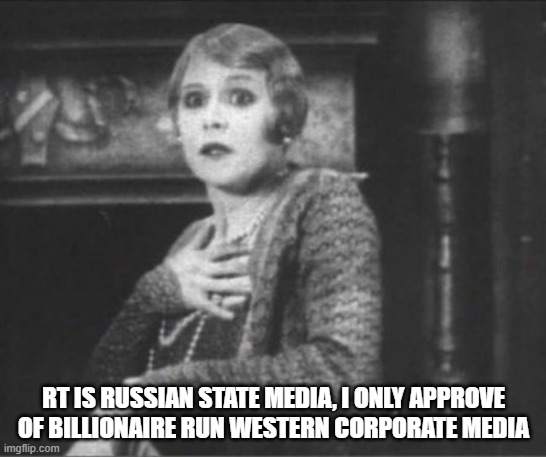 You’re full of shit, sorry my typing isn’t accurate enough for you. There is no dichotomy and you are reading way more into this meme because you personally want to be mad at a strawman. This meme is simply about the people who complain about RT being posted and the joke is that they only trust CNN. That is it. The person says “I only trust western corporate news” and the joke is that RT is in fact no different than western corporate owned billionaire news. The Russian government is run by billionaires too.