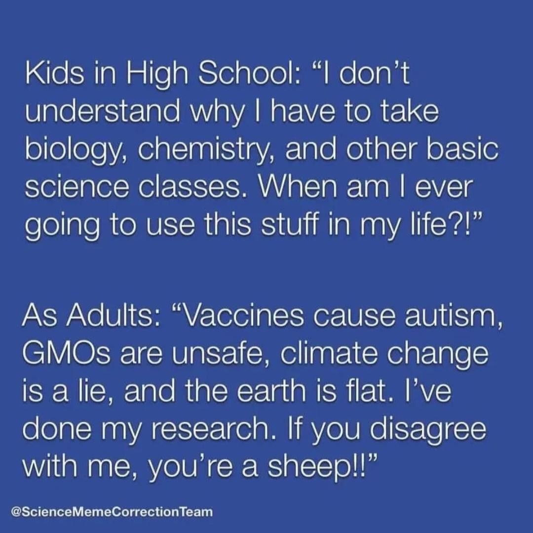 I took the minimum amount of science classes in highschool. Lack of science education is less of a problem than teaching you how to sort through bullshit and analytical thinking. I basically think that our school system needs to stop focusing so hard on teaching things from the textbooks in an ever-changing world that’s cherry picked from an endless wealth of knowledge and focus more on learning how to be skeptical and check various sources and such. In school it seemed like research was always just a backseat to the goal, instead of the goal itself.