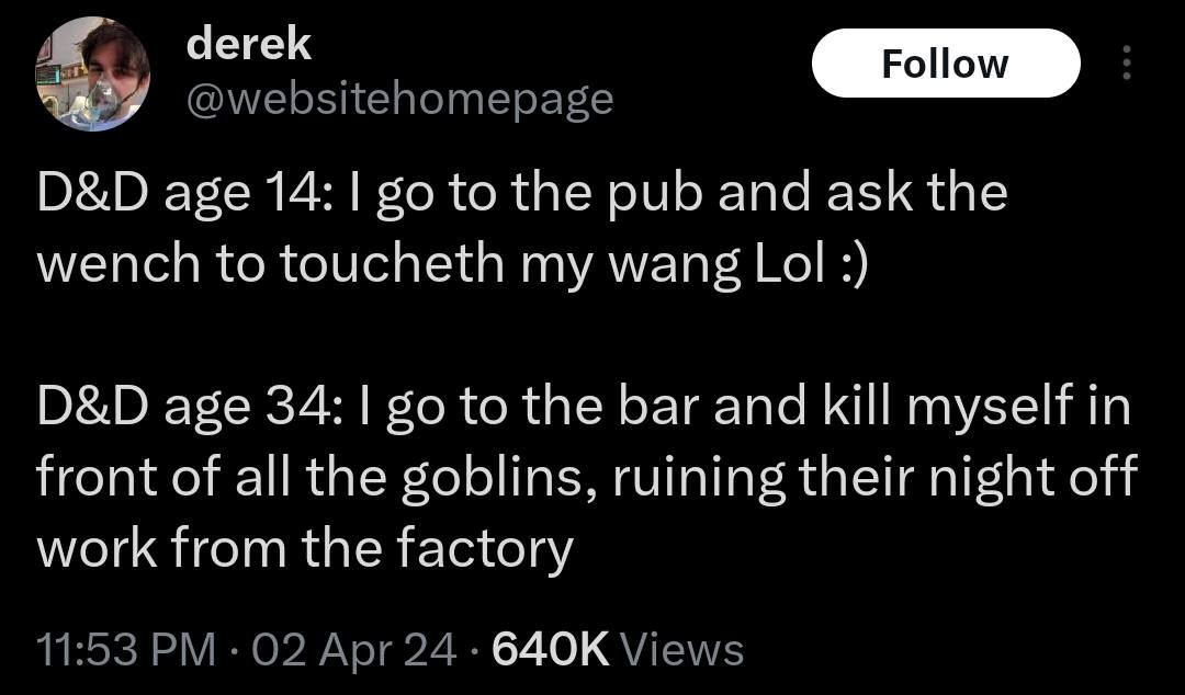 Anyway, we’re just drinking there while that guy I decided I’ll view as a beacon of truth went past, leaned to me and whispered me the bad news that our god was dead. As I found out later, he was mistaken, but I trusted him, so I asked the dwarf if I could have look at his knife and killed myself.