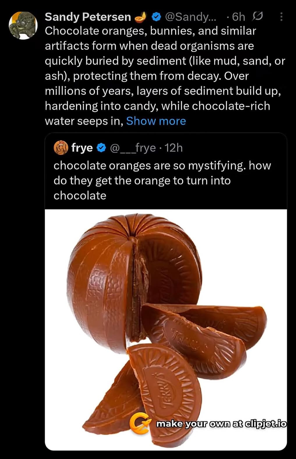Wait, are chocolate oranges just chocolate formed to look like orange slices? All this time I thought it was oranges dipped in chocolate, which has always disgusted me.