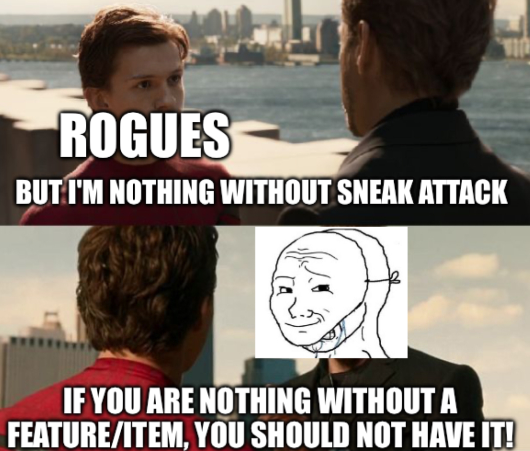 Not in my presence at least. I’m moreso mocking the meme format, as people keep using it whenever someone brings up that their build only works with thing x. I’ve seen it with free feats, smites, 1 level dips, specific feats, magic items, …