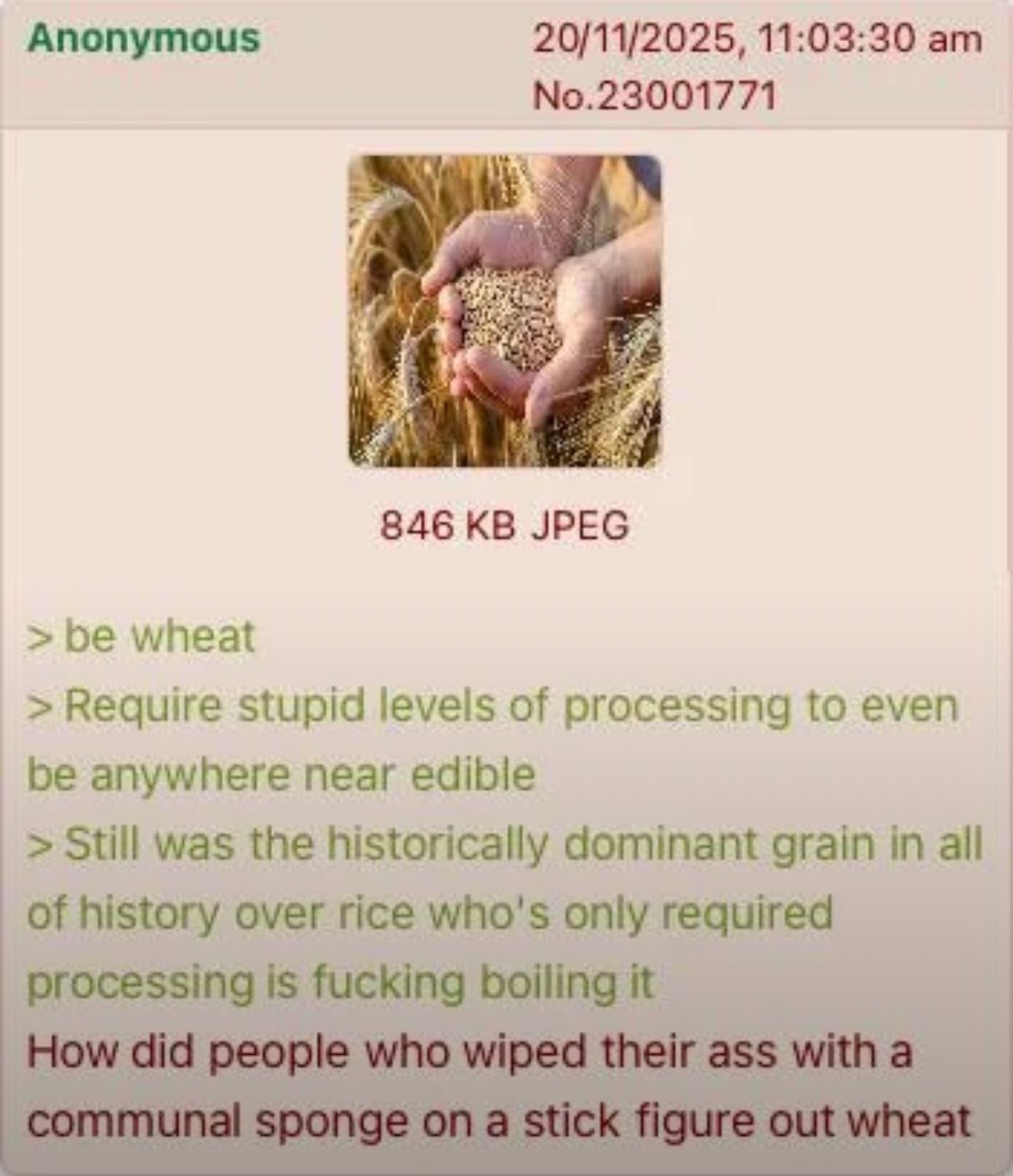 arrow-up1304arrow-down1imageAnon thinks about wheatsh.itjust.worksSine_Fine_Belli@lemmy.world to Science Memes@mander.xyzEnglish · 4 days agomessage-square61fedilinkfile-text