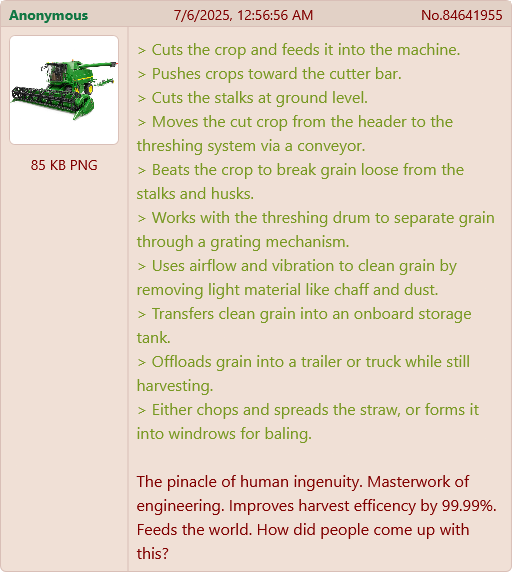 The thing is, I understand computers and space travel, it’s all stuff that makes sense when it’s explained to me properly. I’ve watched like six long form documentaries/explanations of combine harvesters and as far as I’m concerned it’s fucking wizard shit. It’s too complicated to actually work properly, it’s doing way too many entirely different things at once. There are entire multi stage manufacturing plants with less complex engineering requirements, it should jam up or break down two seconds after starting, it spits in the face of Ockham.