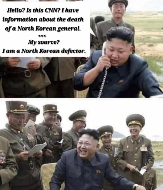 minus-squareNemo's public admirer@lemmy.sdf.orglinkfedilinkarrow-up9·edit-24 days ago Hello? Is this the CNN? I have information that a leftish North Korean general was sent straight to the gulag, for not laughing at the great leader’s supreme joke … My source? I’m a North Korean defector