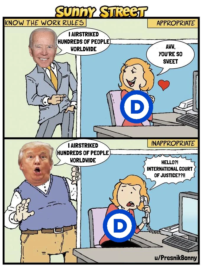 The original version of this meme was problematic but my god this version of it is spot on accurate. And it still would be accurate for countless other things that could be put in the Biden/Trump speech bubble. Despite what Democrats pretend, and how they like to (ineffectively) play the role of opposition to Trump, they are fine with 90% of what he does, he just does it without any deference to the liberal theatrics of “law,” with too much bombast instead of fake personal difficulty making “hard choices,” and because he’s not on team Blue. Granted, there are a few significant things I think it’s safe to say would not have happened under a Democrat president, but vanishingly few of those are things they wouldn’t have wanted to do.