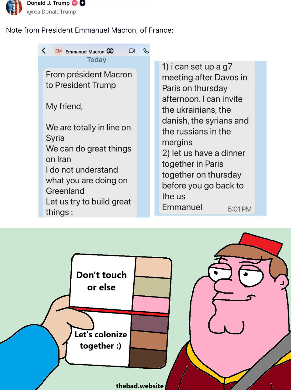 [in a private message to Trump, french president Macron explains they’re aligned on Syria and Iran, but he draws the line at Greenland]