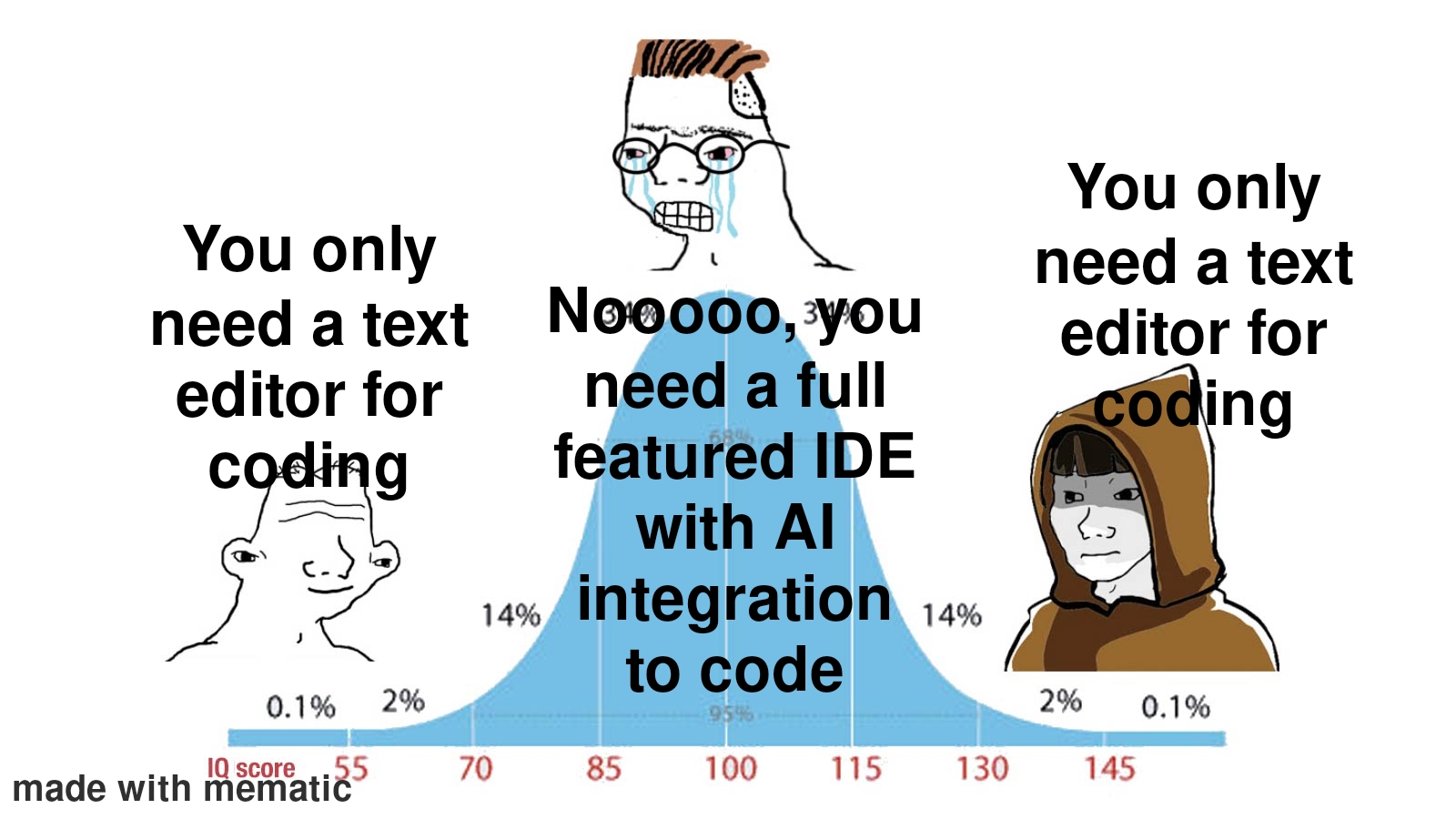 It’s all variable, and highly dependent on the languages you use, the types of applications you develop, your personal workflows, what you learned with and got used to as you were learning to program, and a myriad of other factors. Painting in broad strokes, like what the meme is doing or what you’re doing, is almost never correct. There’s always nuance.