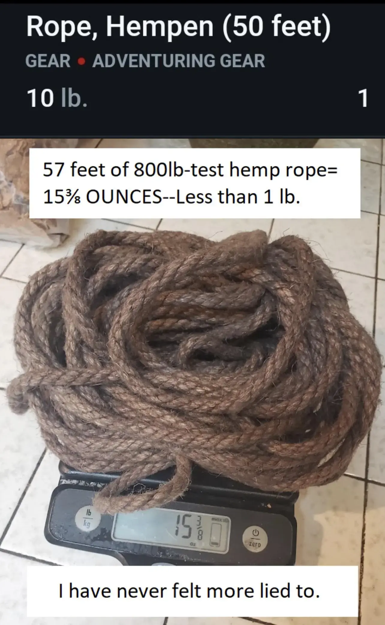 Those rope is unlikely to be able to support a fully kitted adventurer though. Ropes rated for the kinds of weights adventurers often deal with will be at least in the neighborhood of the listed weight, accordang to a similar thread a while back. IIRC one comparable rope weighed something like 4.4 pounds at 50 feet.