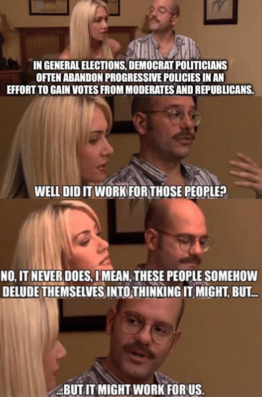 votes from moderates and republicanscampaign contributions from billionaires(Not even a dig, just the economic reality of modern campaign finance. What do you do, as a progressive running against a fascist, if you’re offered a chance to 10x your reach, and “all you have to do” is downplay your most controversial positions?)