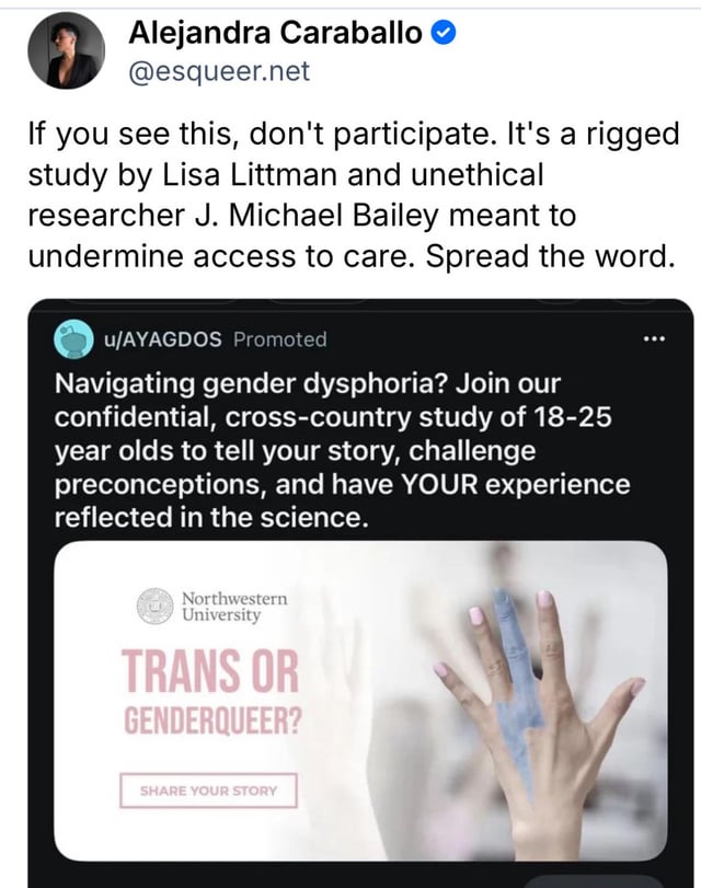 Bailey also is associated with far-right idiots, so yeah. Littman also hasn’t studied trans people before and based her study on anecdotal experience rather than actual in-depth research; and she didn’t survey the actual trans people either about their experiences, and pathologised it.