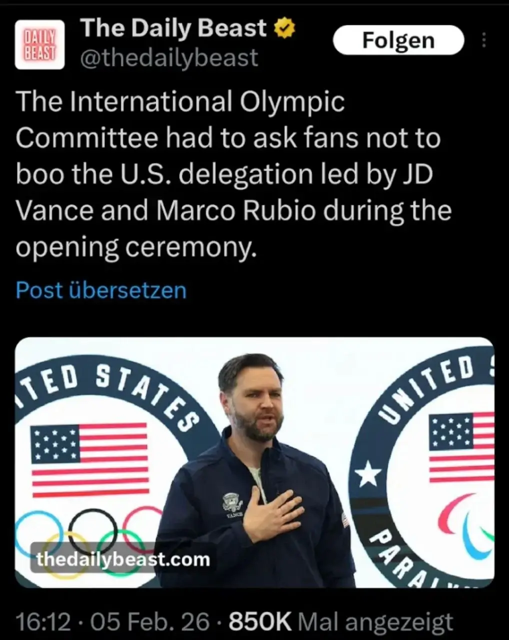 Picture of a tweet with the caption: “The International Olympic Committee had to ask fans not to boo the U.S. delegation led by JD Vance and Marco Rubio during the opening ceremony.”