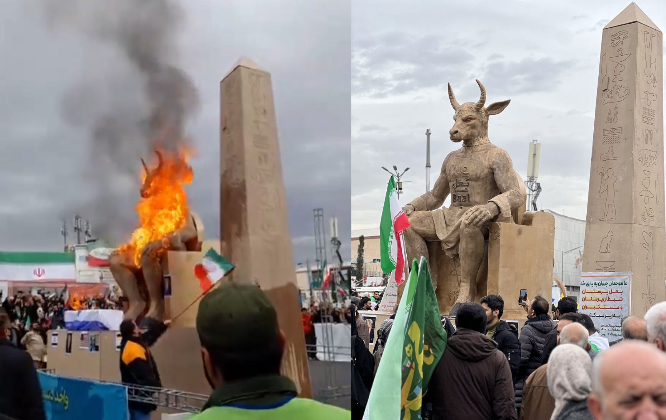 Today, in a symbolic act, Iranians set fire to the flags of Israel and the United States, as well as an obelisk and a statue of Baal—which they described as a symbol of Satan—in various cities across Iran in response to the release of the Epstein documents.