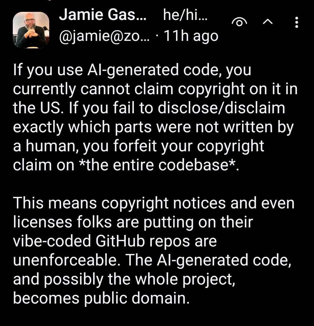In order to make it true we need to pass laws that regulate the AI companies and their slop. In the meantime, I recommend nobody uses slop code. Actually, I’d recommend that regardless of ownership rights.