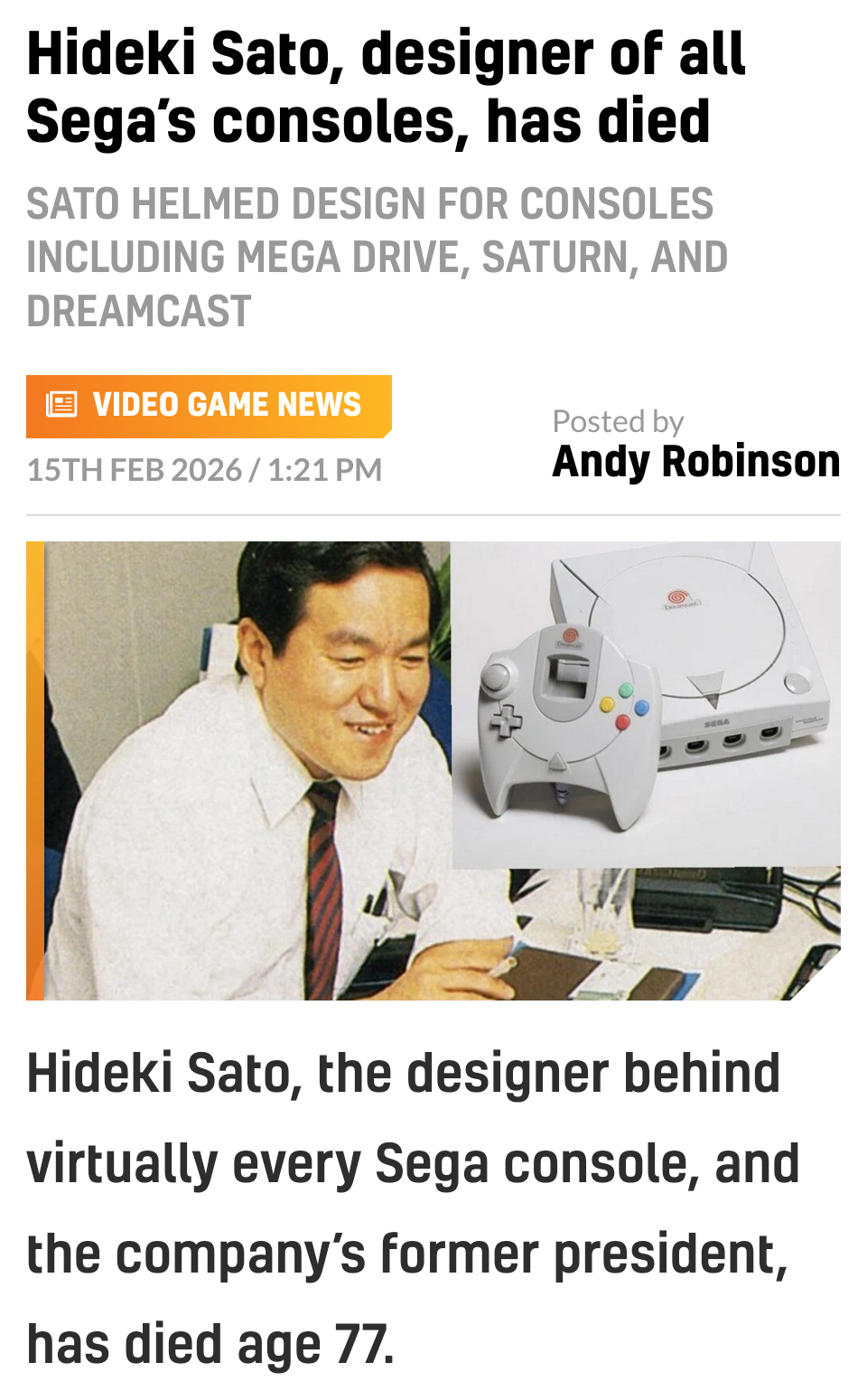 arrow-up1161arrow-down1imageHideki Sato, designer of all Sega’s consoles, has diedlemmy.mlJo Miran@lemmy.ml to Gaming@beehaw.org · 8 days agomessage-square10fedilinkfile-text