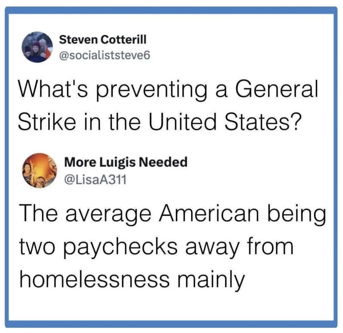 Americans have had every participatory inclination beaten out of them (metaphorically speaking). Their political parties have no participation beyond asking for money and their unions are the same. They’ve been fed a steady drip of 24/7 news designed to keep them afraid of everyone they don’t already know, and that’s by design. Things are going to have to get a lot worse for the average American before they’ll be willing to organize in any meaningful way. I hope this changes, don’t get me wrong, but I expect that it’ll have to get a lot worse before it gets better.