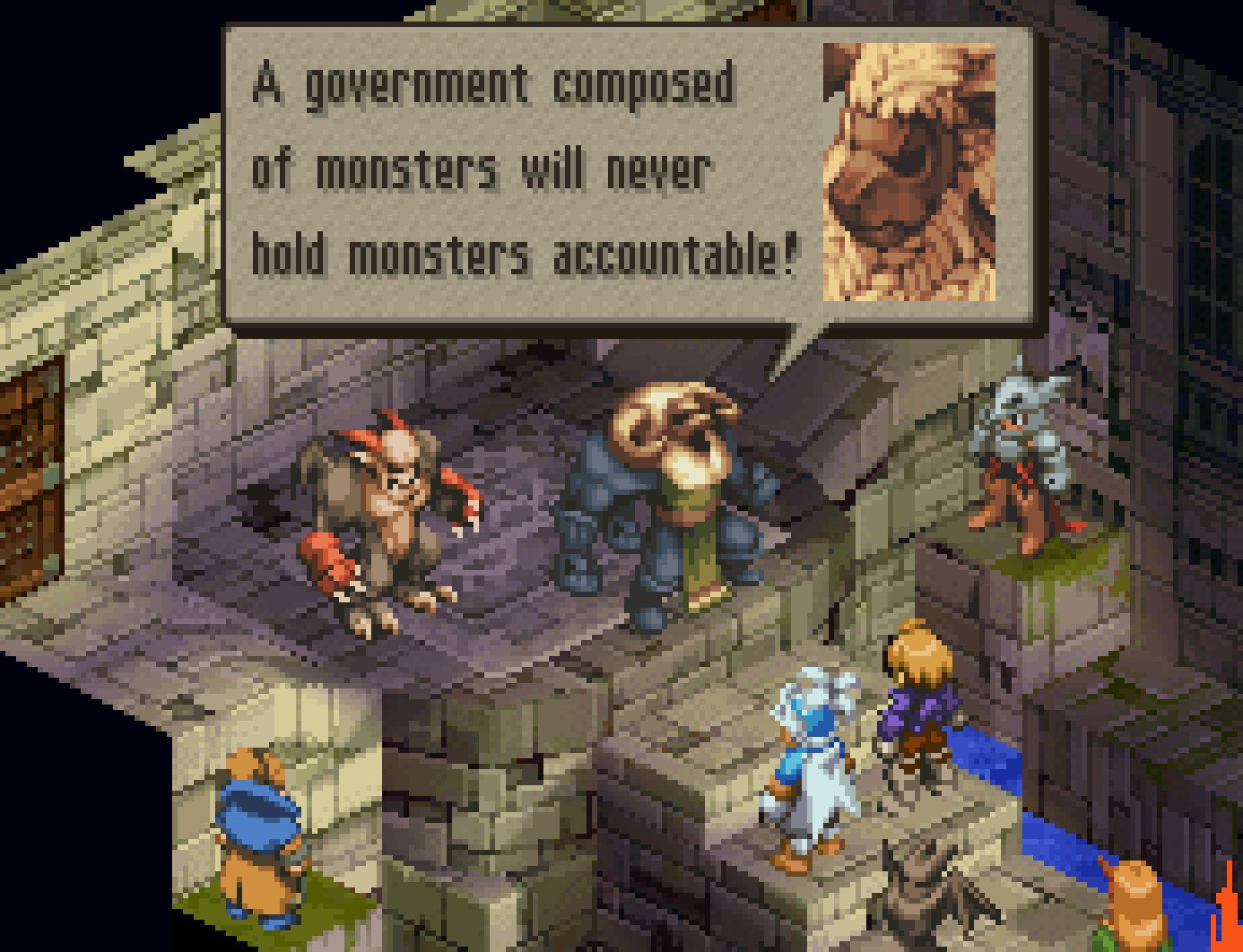 [alt text: A screenshot from Final Fantasy Tactics, showing a scene where a monster is saying, “A government composed of monsters will never hold monsters accountable!”]