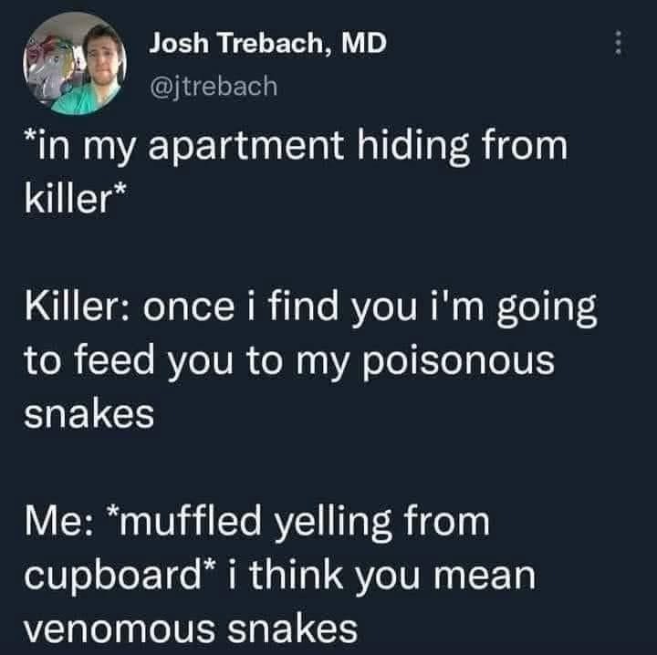 minus-squareAveragejoe@lemmy.orglinkfedilinkEnglisharrow-up3·3 days agoI don’t think anyone owns a venomous snake strong enough venom to kill them.