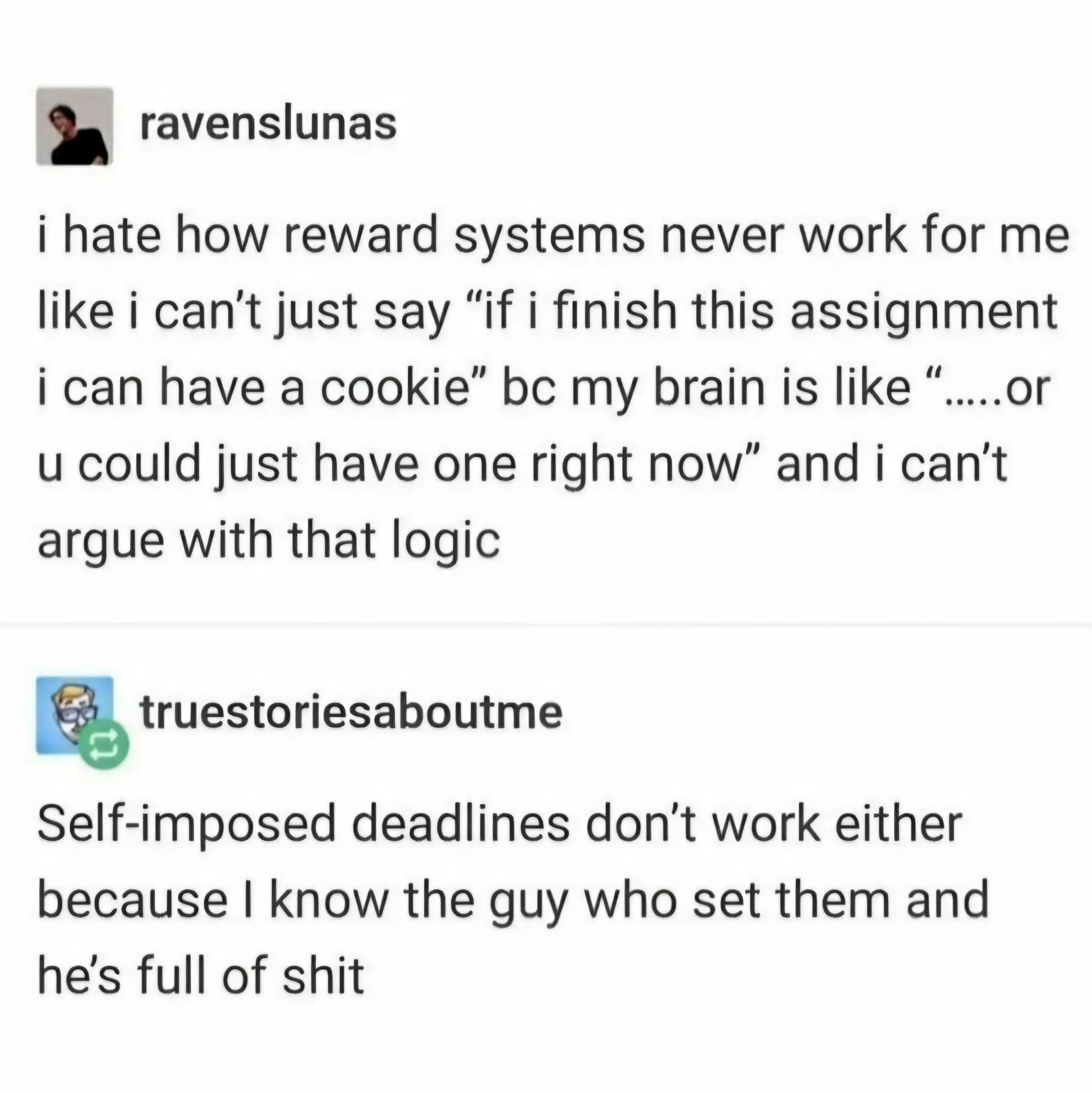 Legit. The only thing that works on me is the anxiety of letting other people down and being the weakest link.