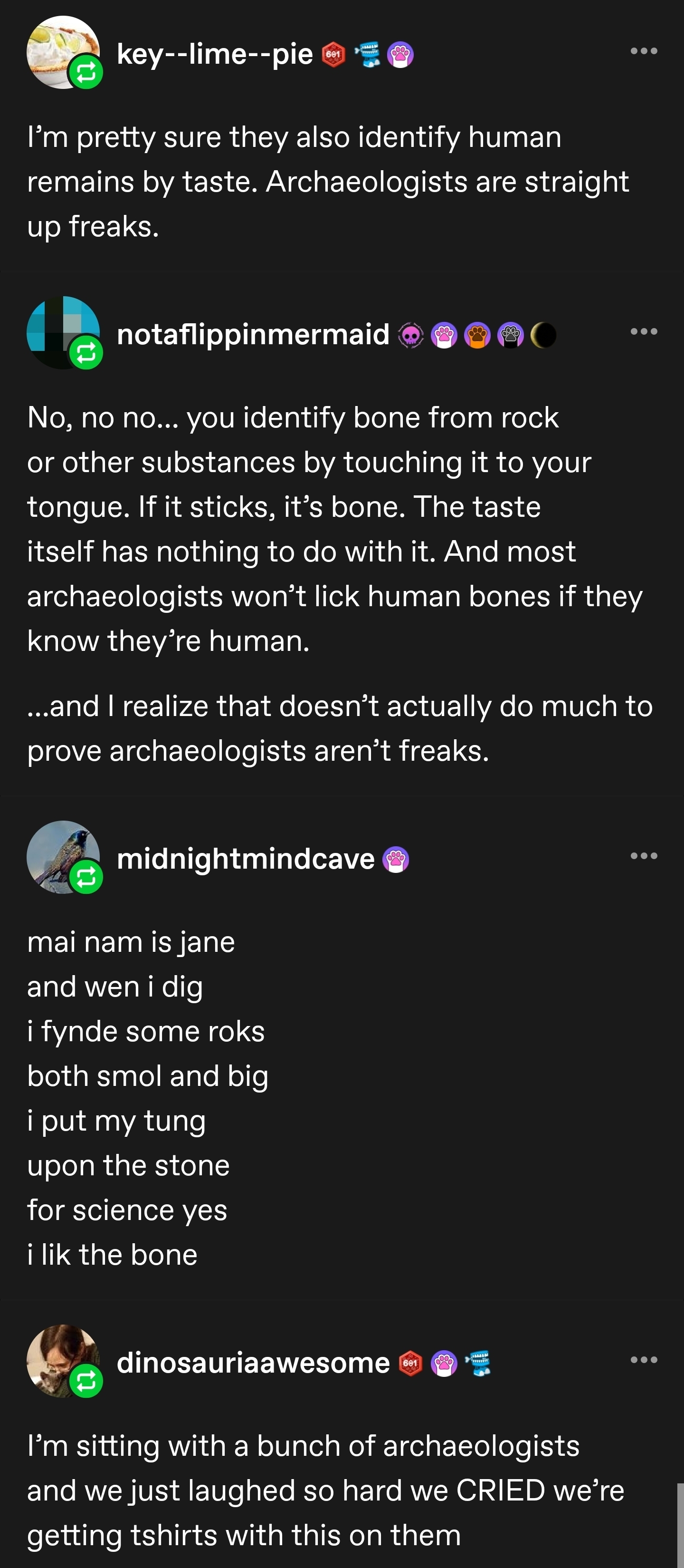 Tumblr thread, one user says that archeologists identify human remains by taste. A second user points out that this is not true, bone is identified as not a normal rock by touching it to your tongue and seeing if it sticks. If it does then bone.