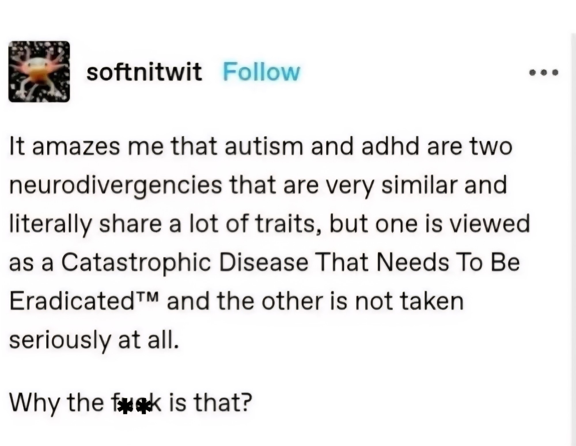 My brother got an ASD diagnosis, and it’s impossible for me to get the other diagnosis. I just accepted that being where I am in my condition, means life is just not viable for me. I don’t even do well in this community.