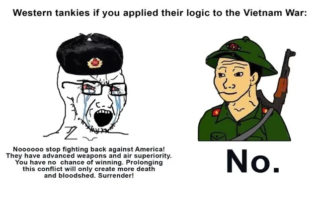 I’d love for you to explain how domestically produced vietnamese resistance to French, Japanese, and American imperialism is materially the same as western powers fighting a proxy war with Russia at the expense of Ukrainian lives.