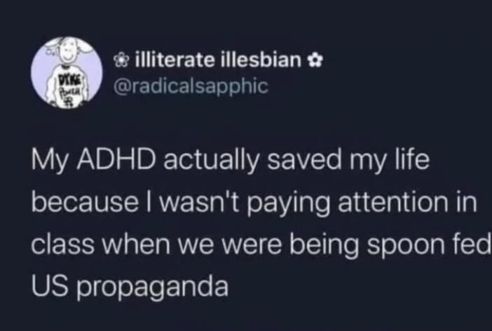 arrow-up1936arrow-down1imageBetween church, school, & targeted advertising my inability to focus has probably helped me subvert more brain washing than I'll ever really know. Maybe it's not so maladaptive in this dystopia?sh.itjust.worksBasic Glitch@sh.itjust.works to ADHD memes@lemmy.dbzer0.comEnglish · 18 days agomessage-square89fedilink