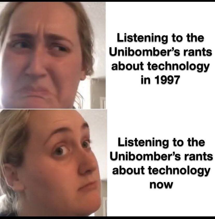 FoxtrotDeltaTango@sh.itjust.works to Programmer Humor@programming.dev · 14 days agoThe unAbomber. Otherwise, I agree.lemmy.worldimagemessage-square3fedilinkarrow-up1216arrow-down113file-text