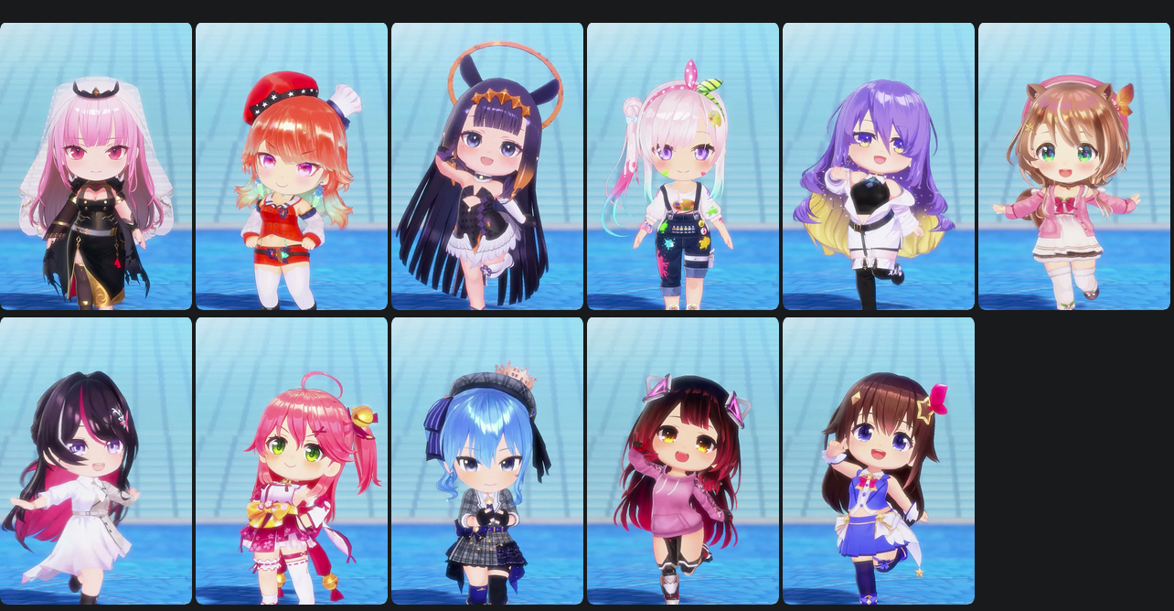 Teasers are from YouTube Shorts from the @hololivedreams channel. In left-to-right order they are: Calli Kiara Ina Iofi Moona Risu AZKi Miko Suisei Roboco Sora A few more have been added since I took the screenshot, you can check them out here!