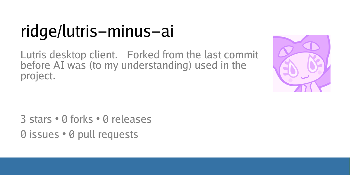 Twig@sopuli.xyz to Linux Gaming@lemmy.mlEnglish · 3 days agolutris-minus-aicodeberg.orgexternal-linkmessage-square19fedilinkarrow-up159arrow-down112