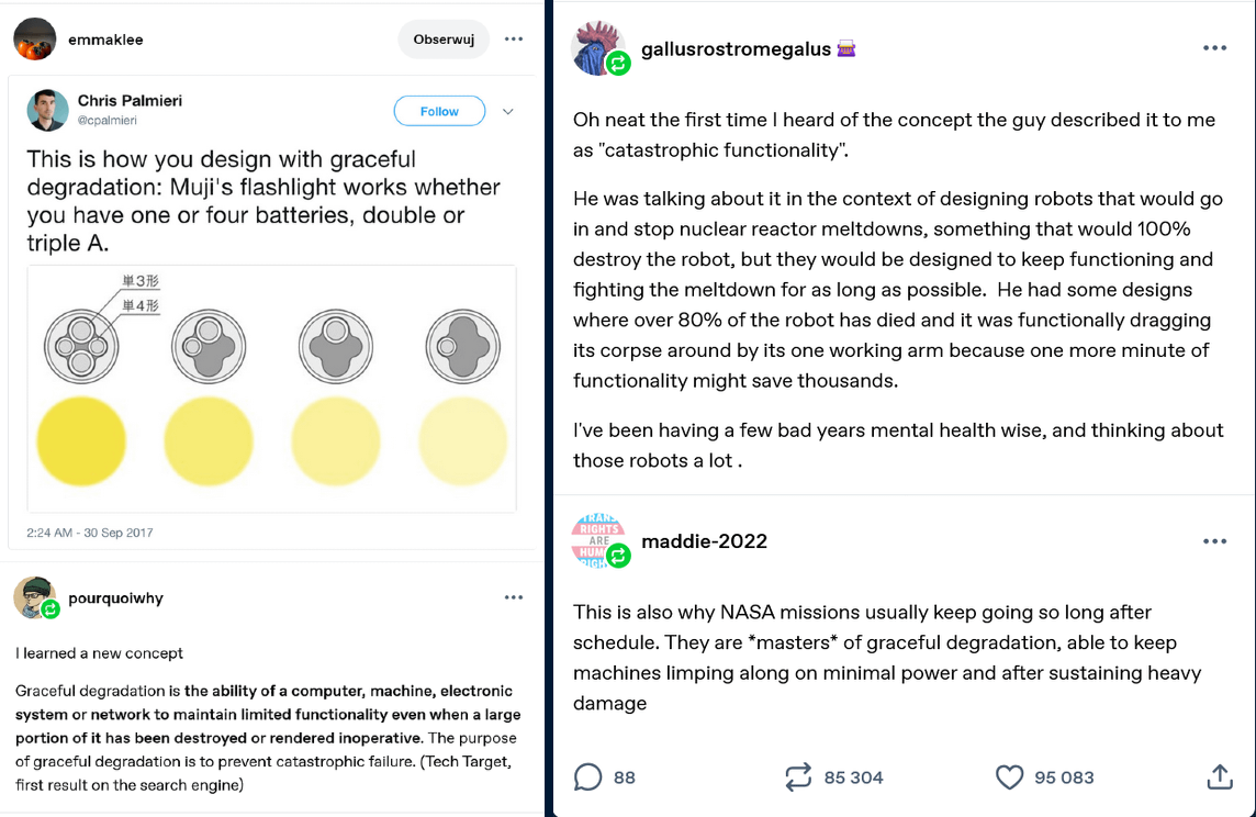 At least someone with some sense can observe the amount of people on an elevator and nope out of that collective act of stupidity. I say that qualifies as graceful degradation.