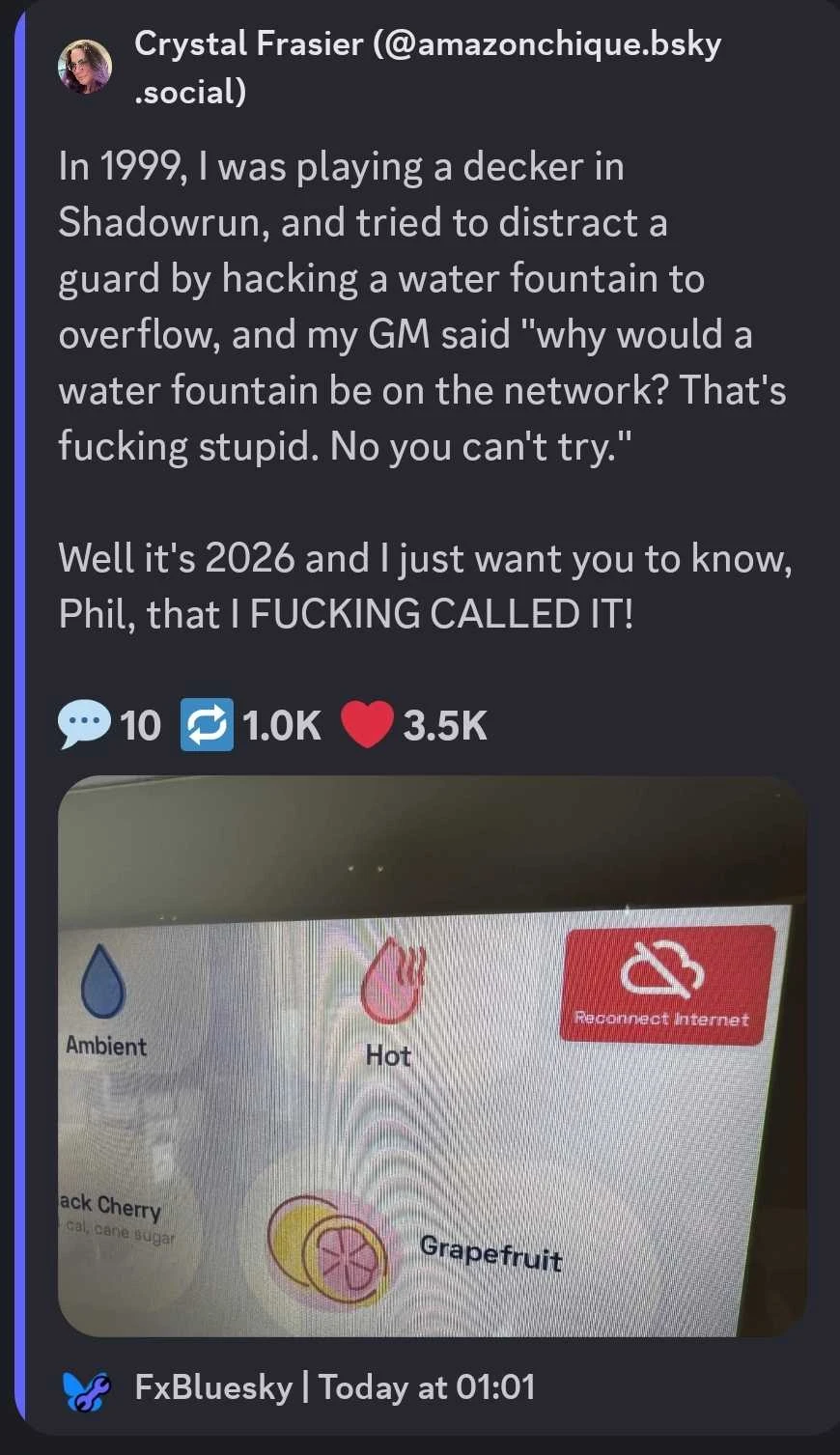 Friend of mine was playing Cyberpunk 2020 and needed a shotgun in-game. He decided that since his character didn’t have a record yet, he would go buy one at wal-mart.