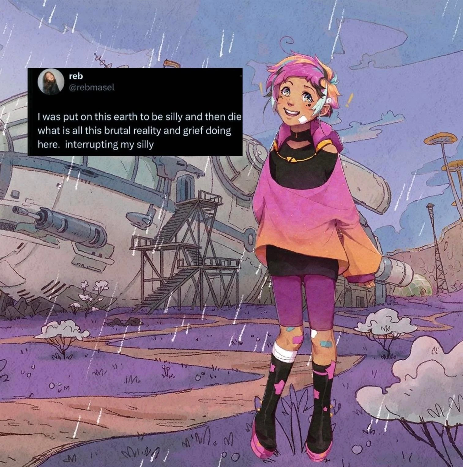 Next to them someone has inserted a screenshot of a post by reb (@rebmasel) which says “I was put on this earth to be silly and then die what is all this brutal reality and grief doing here. interrupting my silly”