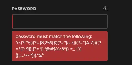 That is a the regex string for that sites password field. Regex is a sequence of characters used to see if an input matches a defined pattern to validate the input in code (theres also other uses but thats what being done here). Sites normally dont show the regex pattern since it is pain to parse even if you know how to write things in regex and to people who dont code this looks like a random output. Im assuming a bug exists that prints out the wrong error string so that this shows instead of the human readable one