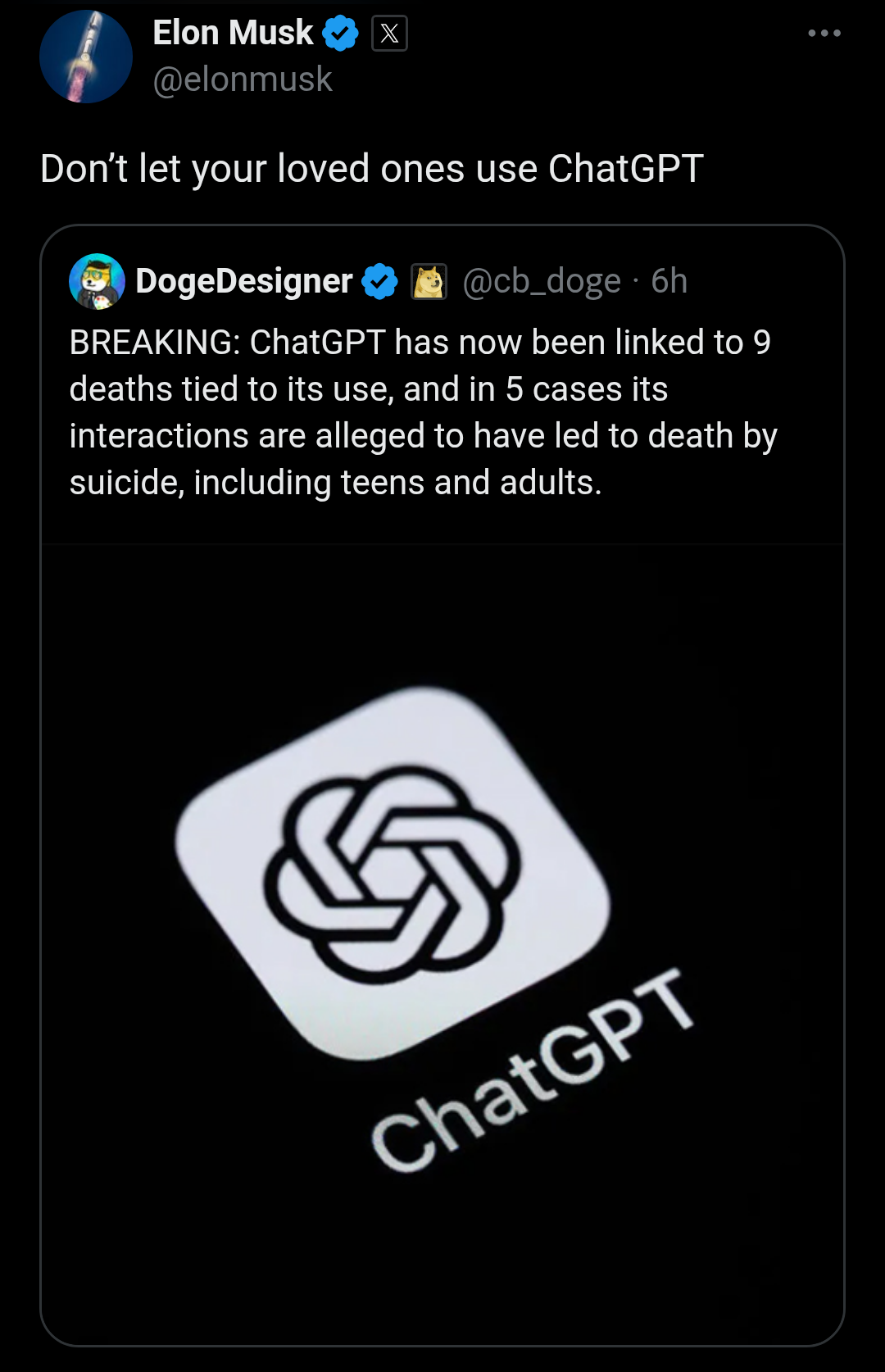 arrow-up1128arrow-down1imageElon Musk and Sam Altman clashed on X after Musk shared a post about a man who committed a murder-suicide following delusional conversations with ChatGPTplus-squarelemmus.orgBeep@lemmus.org to Technology@beehaw.orgEnglish · edit-23 days agomessage-square21fedilink