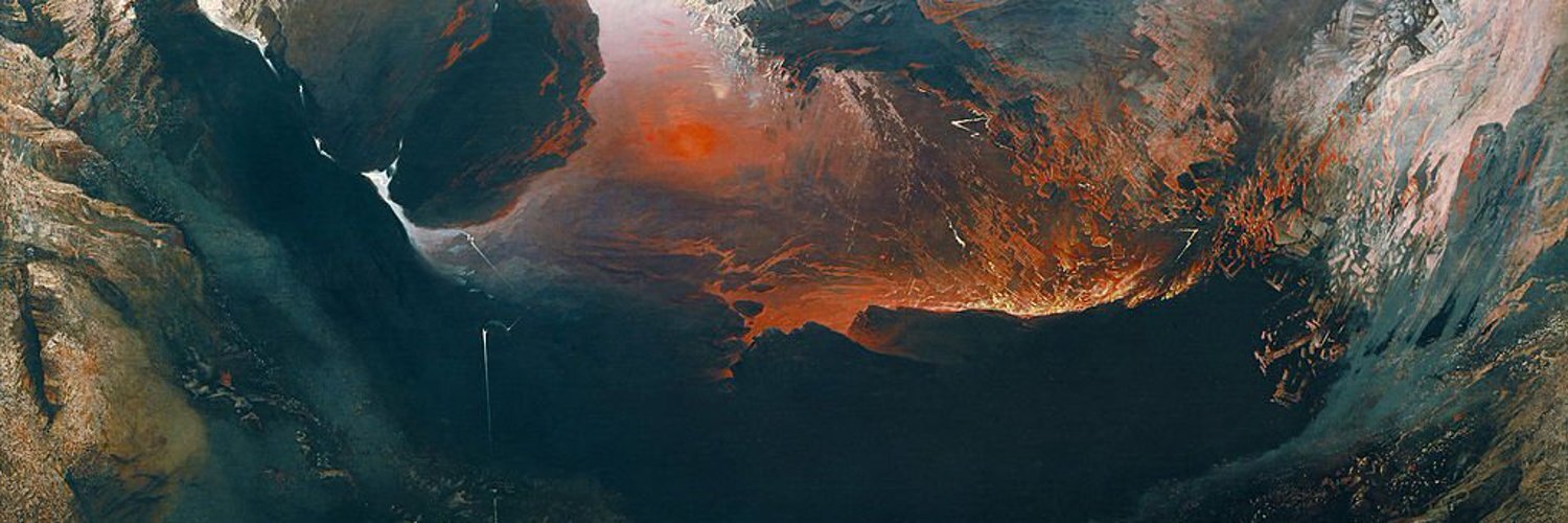 Background: A section from a painting called “The Great Day of His Wrath” by John Martin, which depicts an end of the world scene, featuring what appears to be two large land masses being torn apart, with a dark abyss leading up to fire and magma.